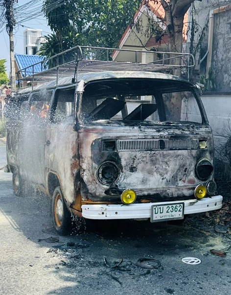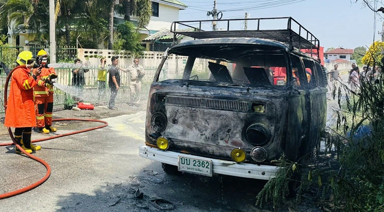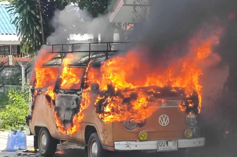 เมื่อถึงจุดเกิดเหตุพบรถตู้สีน้ำตาลส้ม ยี่ห้อโฟล์คสวาเกน ทะเบียน นครราชสีมา จอดอยู่ริมถนน โดยมีเพลิงลุกไหม้อย่างรุนแรงทั่วทั้งคัน เจ้าหน้าที่จึงเร่งฉีดโฟมและใช้อุปกรณ์ดับเพลิงเข้าสกัดเพลิงเพื่อควบคุมสถานการณ์