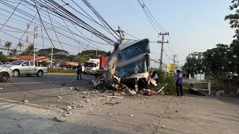 เมื่อเวลา 07.00 น. วันที่ 17 มีนาคม 2569 ผู้สื่อข่าวรายงานว่า เกิดอุบัติเหตุรถทัวร์โดยสารเสียหลักพุ่งชนเสาไฟฟ้า บริเวณริมถนนเพชรเกษม ขาล่องใต้ ในพื้นที่ ต.ห้วยทรายใต้ อ.ชะอำ จ.เพชรบุรี