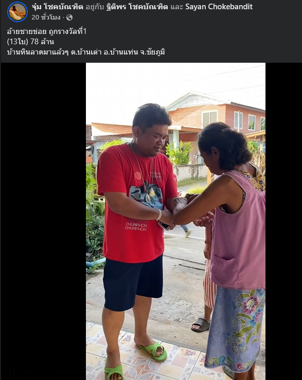 ผู้โชคดีรายนี้คือ เป้า สายัณห์ ชาวบ้านหินลาด ตำบลบ้านเต่า อำเภอบ้านแท่น จังหวัดชัยภูมิ หลังทราบข่าวว่าถูกรางวัลใหญ่ มีญาติพี่น้องและเพื่อนบ้านเดินทางมาร่วมแสดงความยินดีที่บ้านอย่างคึกคัก