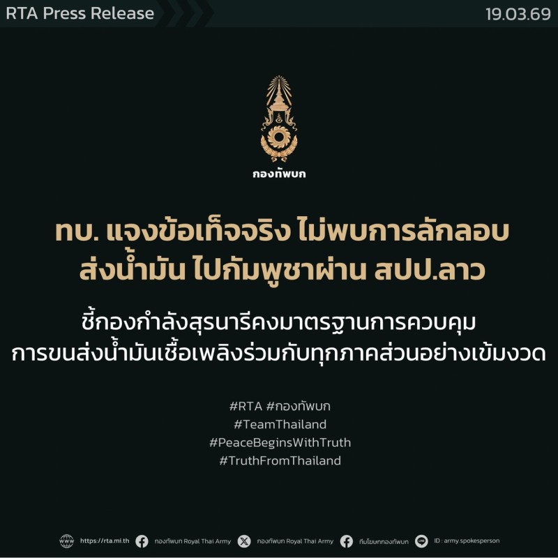 ทบ. แจงข้อเท็จจริง ไม่พบการลักลอบส่งน้ำมันไทยไปกัมพูชาผ่านลาว ชี้กองกำลังสุรนารีคงมาตรฐานการควบคุมการขนส่งน้ำมันเชื้อเพลิงร่วมกับทุกภาคส่วนอย่างเข้มงวด
