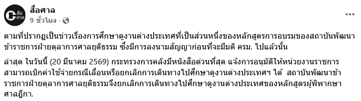 ล่าสุด ในที่ 20 มีนาคม 2569 กระทรวงการคลังมีหนังสือด่วนที่สุด แจ้งการอนุมัติให้หน่วยงานราชการสามารถเบิกค่าใช้จ่ายกรณีเลื่อนหรือยกเลิกการเดินทางไปศึกษาดูงานต่างประเทศฯ ได้ สถาบันพัฒนาข้าราชการฝ่ายตุลาการศาลยุติธรรมจึงยกเลิกการเดินทางไปศึกษาดูงานต่างประเทศของหลักสูตรผู้พิพากษาศาลฎีกา