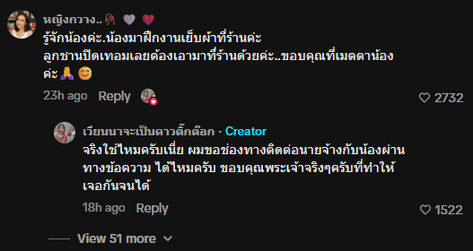 หลังเห็นข้อความดังกล่าว เจ้าของช่องได้ตอบกลับด้วยความดีใจ พร้อมสอบถามช่องทางติดต่อของนายจ้างและหญิงสาวผ่านข้อความส่วนตัว โดยระบุว่า