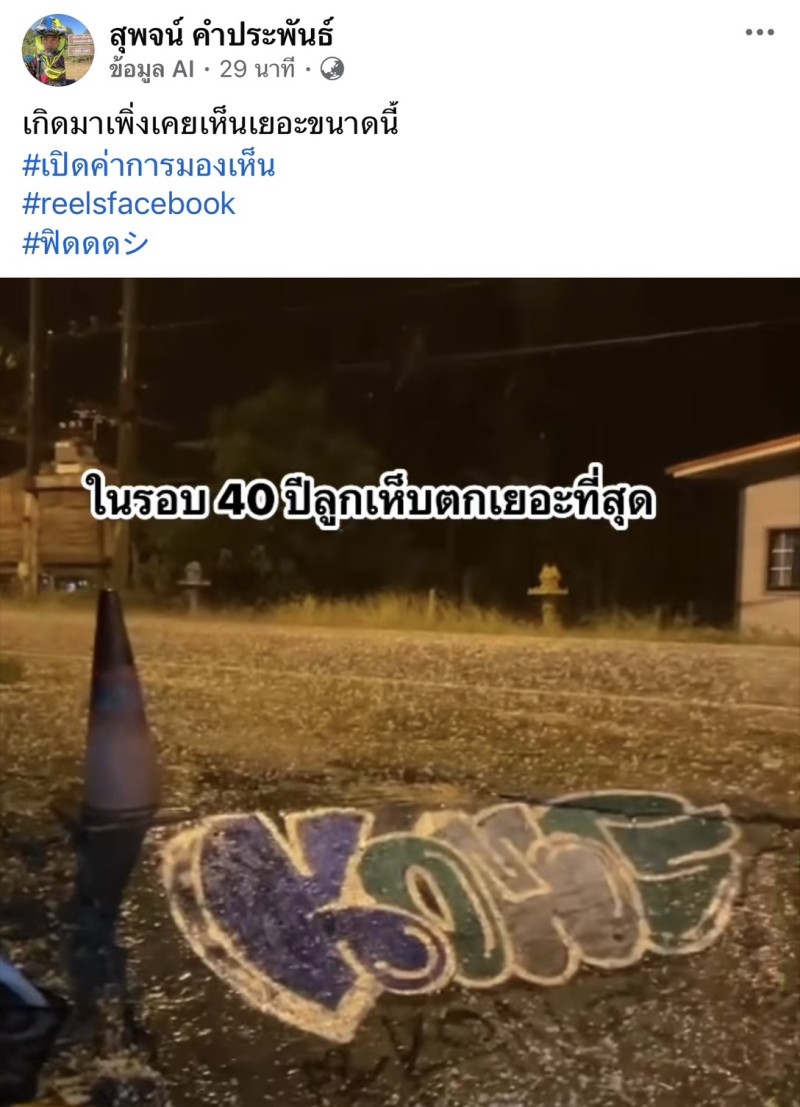 เหตุการณ์นี้ถูกเผยแพร่ผ่านคลิปวิดีโอจากผู้ใช้เฟซบุ๊ก “สุพจน์ คำประพันธ์” และ “May Wongong” ซึ่งแสดงให้เห็นภาพลูกเห็บขนาดใหญ่ตกลงมาอย่างต่อเนื่องจนพื้นดินขาวโพลน นอกจากนี้ นายสุพจน์ยังได้โพสต์ภาพขณะเก็บลูกเห็บใส่เหยือกพลาสติกจำนวนมาก พร้อมระบุว่าเป็นเหตุการณ์ลูกเห็บที่ตกหนักที่สุดในรอบ 40 ปี