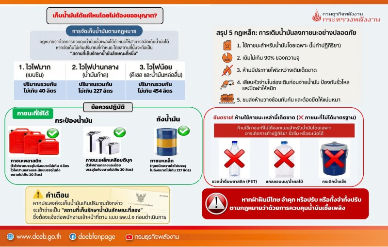กรมธุรกิจพลังงาน กระทรวงพลังงาน ประชาสัมพันธ์ข้อกฎหมายเกี่ยวกับการจัดเก็บน้ำมันเชื้อเพลิง พร้อมแนะนำแนวทางการเติมและเก็บรักษาน้ำมันอย่างถูกต้องตามกฎหมาย เพื่อป้องกันอันตรายและลดความเสี่ยงจากอัคคีภัย