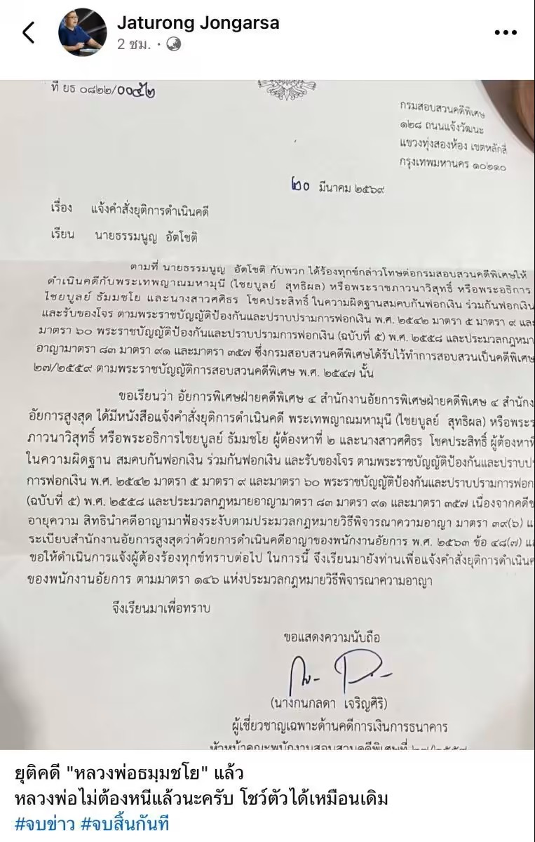 พร้อมกันนี้ ได้โพสต์ภาพเอกสารกรมสอบสวนคดีพิเศษ เรื่องแจ้งคำสั่งยุติดำเนินคดีพระธัมมชโย ความว่า ตามที่ นายธรรมนูญ อัตโชติ กับพวก ได้ร้องทุกข์กล่าวโทษต่อกรมสอบสวนคดีพิเศษให้ดำเนินคดีกับ พระเทพญาณมหามุนี (ไชยบูลย์ สุทธิผล) หรือพระราชภาวนาวิสุทธิ์ หรือพระอธิการไชยบูลย์ ธัมมชโย และนางสาวศศิธร โชคประสิทธิ์ ในความผิดฐานสมคบกันฟอกเงิน ร่วมกันฟอกเงิน และรับของโจร ตามพระราชบัญญัติป้องกันและปราบปรามการฟอกเงิน พ.ศ. 2542 มาตรา 5 มาตรา 9 และมาตรา 60 พระราชบัญญัติป้องกันและปราบปรามการฟอกเงิน (ฉบับที่ 5) พ.ศ. 2558 และประมวลกฎหมายอาญามาตรา 83 มาตรา 91 และมาตรา 357 ซึ่งกรมสอบสวนคดีพิเศษได้รับไว้ทำการสอบสวนเป็นคดีพิเศษ 27/2559 ตามพระราชบัญญัติการสอบสวนคดีพิเศษ พ.ศ. 2547 นั้น
