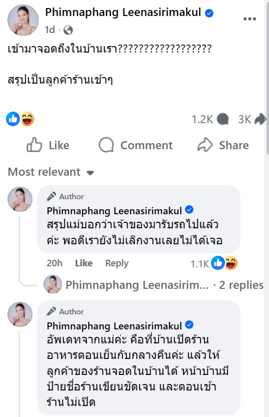 คุณพิมยังเล่าเพิ่มเติมว่า ก่อนหน้านี้บริเวณซอยดังกล่าวเคยมีปัญหาเรื่องการจอดรถอยู่บ่อยครั้ง เนื่องจากเป็นซอยแคบ ลักษณะคล้ายย่านทองหล่อ และมีกฎให้จอดรถสลับฝั่งตามวันคู่-วันคี่ แต่ลูกค้าของร้านอาหารมักจอดรถทั้งสองฝั่ง ส่งผลให้การสัญจรลำบาก และเคยเกิดปัญหารถติดยาวไปถึงปากซอย