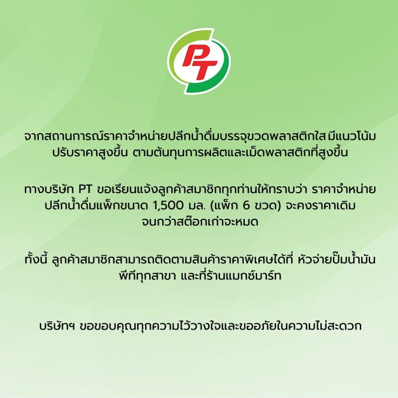 จากสถานการณ์ราคาจำหน่ายปลีกน้ำดื่มบรรจุขวดพลาสติกใส มีแนวโน้มปรับราคาสูงขึ้น ตามต้นทุนการผลิตและเม็ดพลาสติกที่สูงขึ้น ทางบริษัท PT ขอเรียนแจ้งลูกค้าสมาชิกทุกท่านให้ทราบว่า ราคาจำหน่ายปลีกน้ำดื่มแพ็กขนาด 1,500 มิลลิลิตร (แพ็ก 6 ขวด) จะคงราคาเดิม จนกว่าสต๊อกเก่าจะหมด