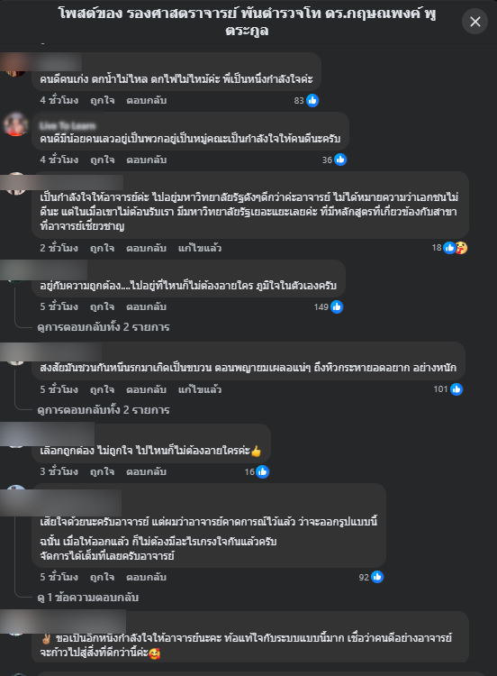 อย่างวไรก็ตาม หลังจากที่ได้โพสต์ข้อความดังกล่าวออกไป ต่างมีชาวเน็ตเข้ามาให้กำลังใจจำนวนมาก ขณะที่เฟซบุ๊กของมหาวิทยาลัย ยังไม่มีคำชี้แจงเกี่ยวกับเรื่องดังกล่าวแต่อย่างใด