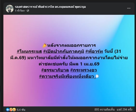 หลังจากผมออกรายการ #โหนกระแส #เปิดปากกับภาคภูมิ พี่อาร์ท วันนี้ (31 มี.ค.69) มหาวิทยาลัยมีคำสั่งให้ผมออกจากงานโดยไม่จ่ายค่าชดเชยครับ มีผล 1 เม.ย.69 #ธรรมาภิบาล #กระทรวงอว #ความจริงมีเพียงหนึ่งเดียว