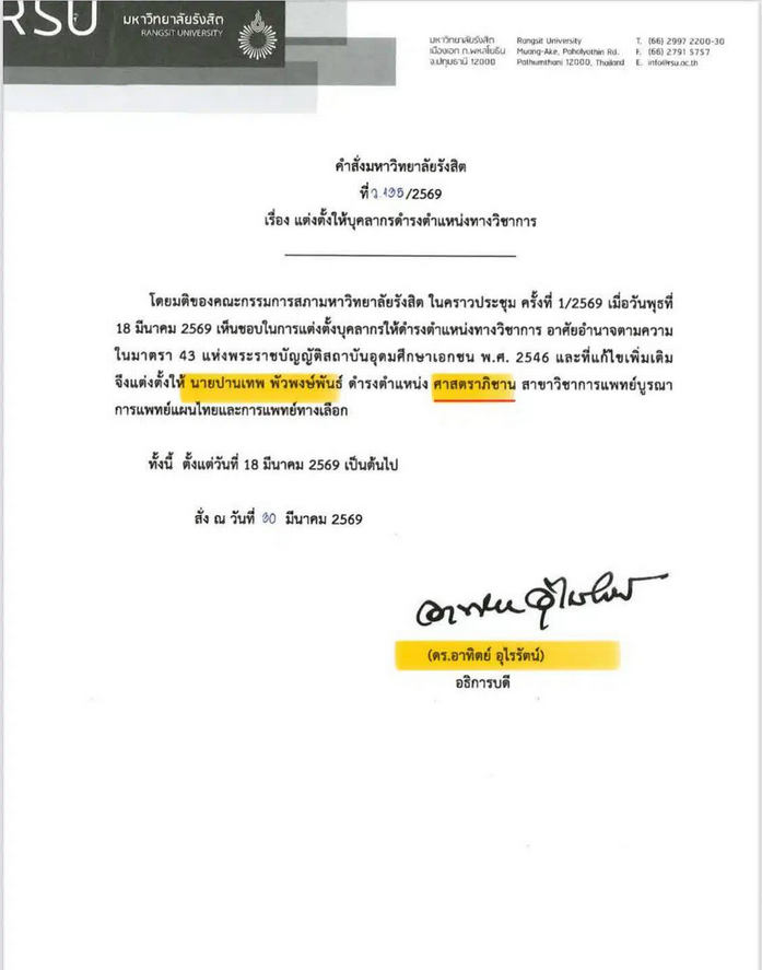 ทั้งนี้ จากมติที่ประชุมคณะกรรมการสภามหาวิทยาลัยรังสิต ครั้งที่ 1/2569 เมื่อวันพุธที่ 18 มีนาคม 2569 ได้มีมติเห็นชอบแต่งตั้ง นายปานเทพ พัวพงษ์พันธ์ ให้ดำรงตำแหน่ง ศาสตราภิชาน สาขาวิชาการแพทย์บูรณาการ การแพทย์แผนไทย และการแพทย์ทางเลือก โดยอาศัยอำนาจตามมาตรา 43 แห่งพระราชบัญญัติสถาบันอุดมศึกษาเอกชน พ.ศ. 2546 และฉบับแก้ไขเพิ่มเติม ซึ่งมีผลตั้งแต่วันที่ 18 มีนาคม 2569 เป็นต้นไป