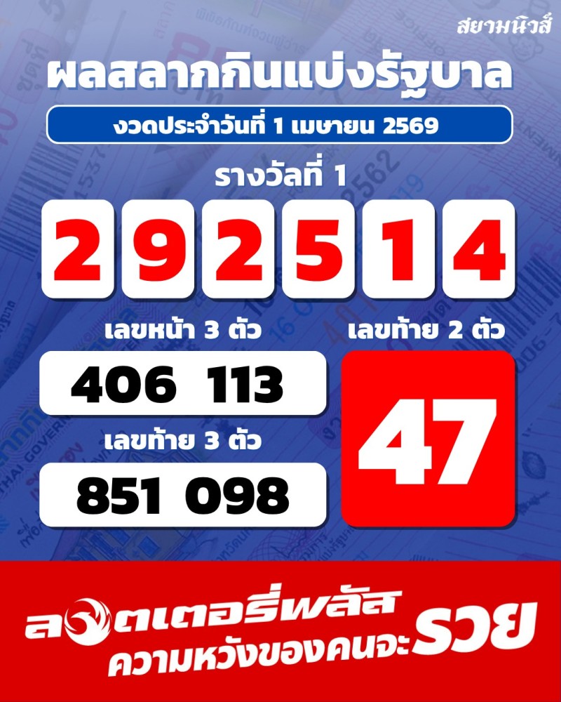 ออกไปเป็นที่เรียบร้อยแล้ว สำหรับการออกรางวัล ประจำวันที่ 1 เมษายน 2569