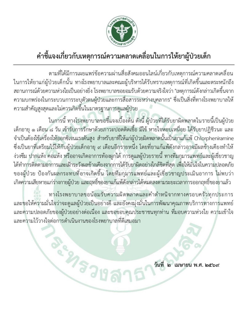 ล่าสุด วันที่ 2 เมษายน 2569 โรงพยาบาลด่านช้าง จังหวัดสุพรรณบุรี สังกัดกระทรวงสาธารณสุข ออกเอกสารชี้แจงกรณีเกิดความคลาดเคลื่อนในการให้ยาผู้ป่วยเด็ก หลังพ่อแม่ร้องเรียนว่าโรงพยาบาลฉีดยาผิดให้ทารกวัย 1 เดือน จนอาการหนักโคม่าและเสี่ยงหัวใจหยุดเต้น จนกลายเป็นกระแสวิพากษ์วิจารณ์ในสังคมออนไลน์ก่อนหน้านี้