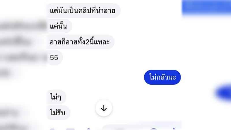 นอกจากนี้ ทีมข่าวยังได้รับแช็ตข้อความเหตุการณ์เมื่อ 5 ปีก่อน ซึ่งเป็นบทสนทนาระหว่างนายนิกร (ฝั่งซ้าย) กับนางสาวเอ (นามสมมติ) อดีตแฟนสาว โดยมีเนื้อหาที่ฝ่ายชายอ้างว่ามีคลิปลับที่น่าอับอาย หลังฝ่ายหญิงขอเลิก พร้อมระบุว่า หากจะอาย ก็อายพร้อมกัน สร้างความหวาดกลัวให้ฝ่ายหญิงในขณะนั้นอย่างมาก
