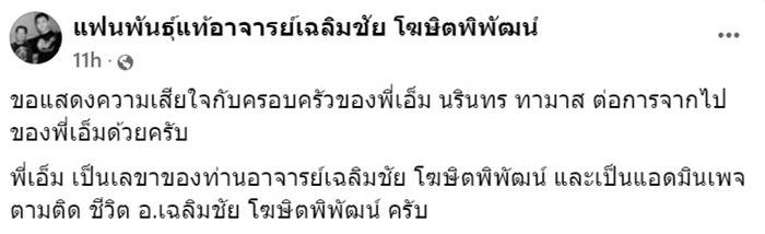 ขณะที่แฟนคลับอาจารย์เฉลิมชัย ต่างเข้ามาอาลัย ส่วนบางคนก็เล่าว่า เพิ่งคุยกันไปไม่นานเอง