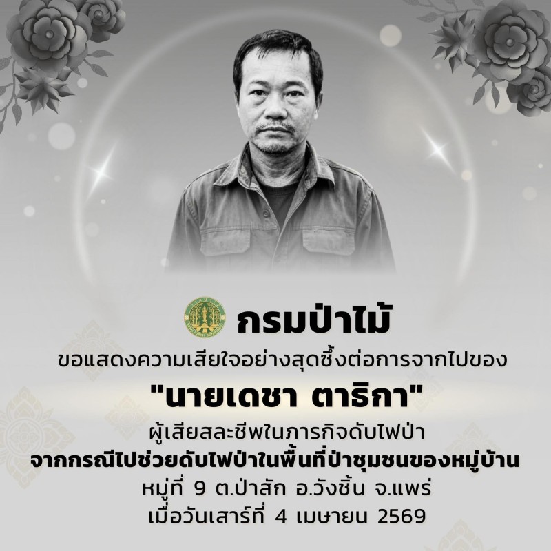 เมื่อวันที่ 5 เมษายน 2569 ที่ผ่านมา เพจ กรมป่าไม้ โพสต์ภาพและข้อความแสดงความอาลัยต่อการสูญเสียเจ้าหน้าที่ผู้ปฏิบัติหน้าที่ โดยระบุว่า