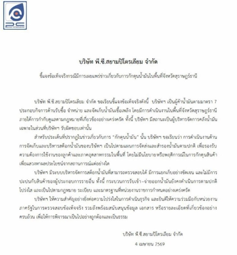 วันที่ 6 เมษายน 2569 บริษัท พี.ซี.สยามปิโตรเลียม จำกัด ออกแถลงการณ์ชี้แจงกรณีถูกพาดพิงว่ามีการกักตุนน้ำมันในพื้นที่จังหวัดสุราษฎร์ธานี โดยยืนยันว่าข้อมูลดังกล่าวคลาดเคลื่อน และส่งผลกระทบต่อชื่อเสียงของบริษัทอย่างมาก