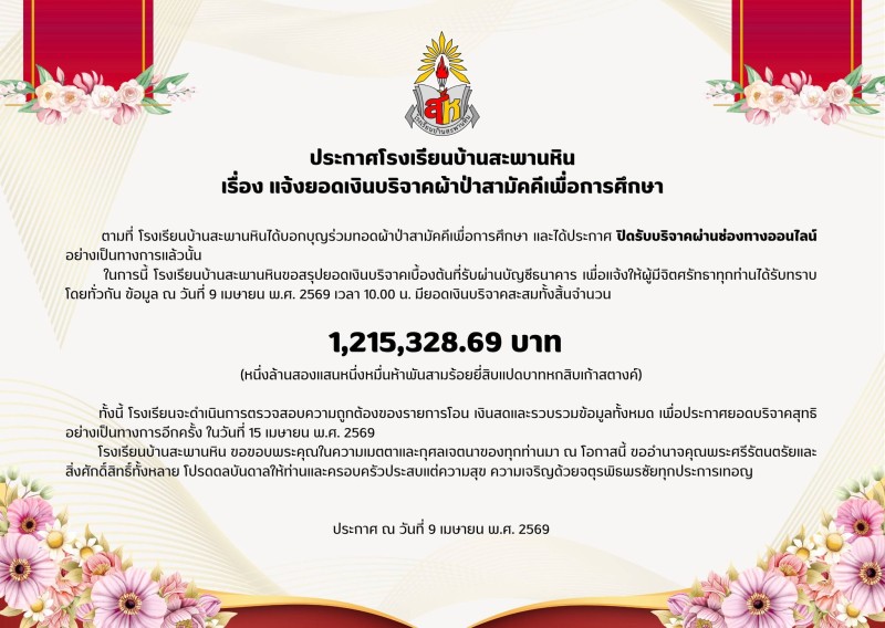 พร้อมกันนี้ ทางโรงเรียนยังได้เปิดเผยยอดเงินบริจาคล่าสุด ซึ่งพุ่งสูงถึง 1,215,382.69 บาท ท่ามกลางความดีใจและความตื้นตันของทั้งคณะครู ผู้ปกครอง รวมถึงชาวเน็ตที่ติดตามเรื่องราวมาตั้งแต่เริ่มต้น โดยหลายคนต่างร่วมอนุโมทนาบุญและชื่นชมพลังของสังคมออนไลน์ที่ช่วยส่งต่อโอกาสทางการศึกษาให้กับเด็ก ๆ อย่างแท้จริง