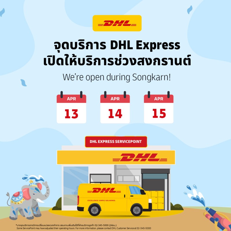 DHL Express แจ้งให้ทราบว่าจุดบริการของเรายังคงเปิดให้บริการส่งของระหว่างประเทศในช่วงเทศกาลสงกรานต์ 2569 ระหว่างวันที่ 13 - 15 เมษายน 2569 อย่างไรก็ตามมีการปรับเปลี่ยนเวลาทำการรวมถึงปิดให้บริการบางสาขาโดยมีรายละเอียดดังนี้