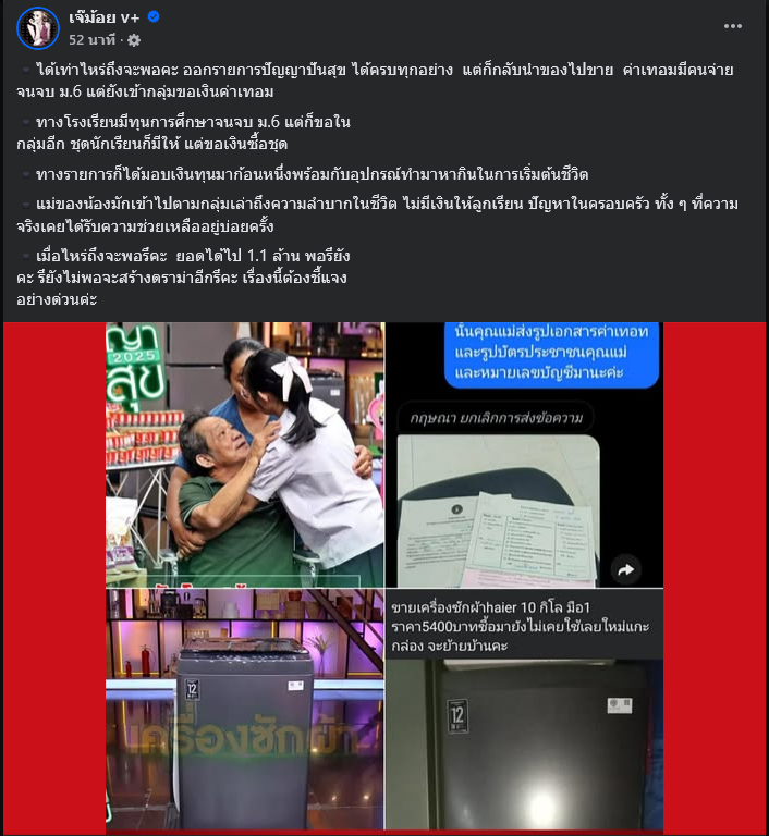 ต่อมาเพจเฟซบุ๊ก เจ๊ม้อย v+ ก็ได้โพสต์อีกว่า ได้เท่าไหร่ถึงจะพอคะ ออกรายการปัญญาปันสุข ได้ครบทุกอย่าง แต่ก็กลับนำของไปขาย ค่าเทอมมีคนจ่าย จนจบ ม.6 แต่ยังเข้ากลุ่มขอเงินค่าเทอม