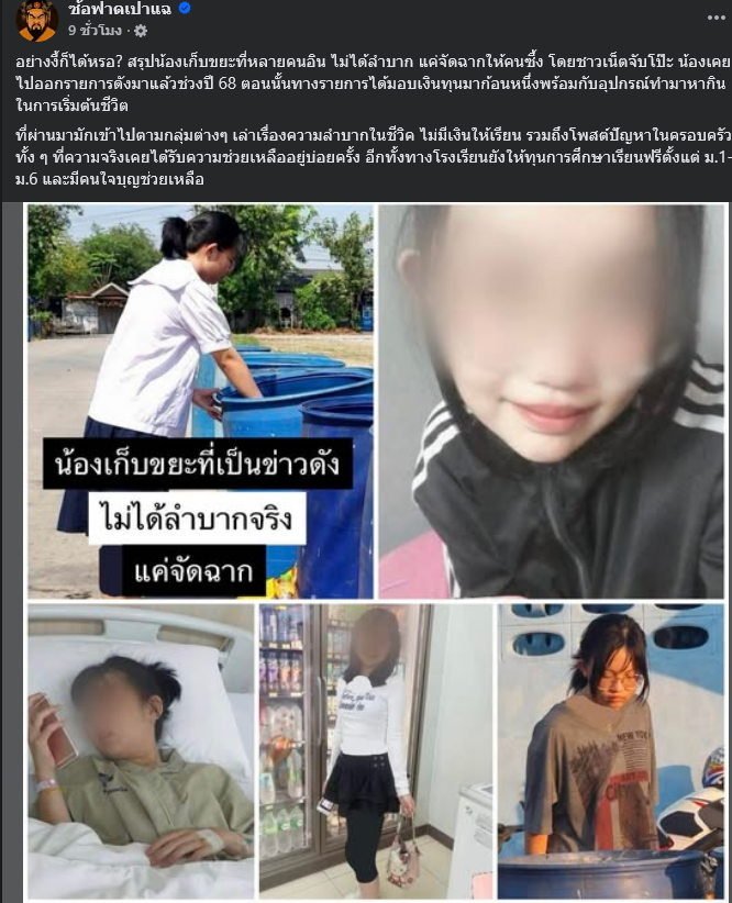 ล่าสุด ส่อแววดราม่า เมื่อเพจเฟซบุ๊ก ซ้อฟาดเปาแฉ ได้ออกมาโพสต์เรื่องราวของน้องอีกครั้งระบุว่า อย่างงี้ก็ได้หรอ? สรุปน้องเก็บขยะที่หลายคนอิน ไม่ได้ลำบาก แค่จัดฉากให้คนซึ้ง โดยชาวเน็ตจับโป๊ะ น้องเคยไปออกรายการดังมาแล้วช่วงปี 68 ตอนนั้นทางรายการได้มอบเงินทุนมาก้อนหนึ่งพร้อมกับอุปกรณ์ทำมาหากินในการเริ่มต้นชีวิต ที่ผ่านมามักเข้าไปตามกลุ่มต่างๆ เล่าเรื่องความลำบากในชีวิค ไม่มีเงินให้เรียน รวมถึงโพสต์ปัญหาในครอบครัว ทั้ง ๆ ที่ความจริงเคยได้รับความช่วยเหลืออยู่บ่อยครั้ง อีกทั้งทางโรงเรียนยังให้ทุนการศึกษาเรียนฟรีตั้งแต่ ม.1-ม.6 และมีคนใจบุญช่วยเหลือ