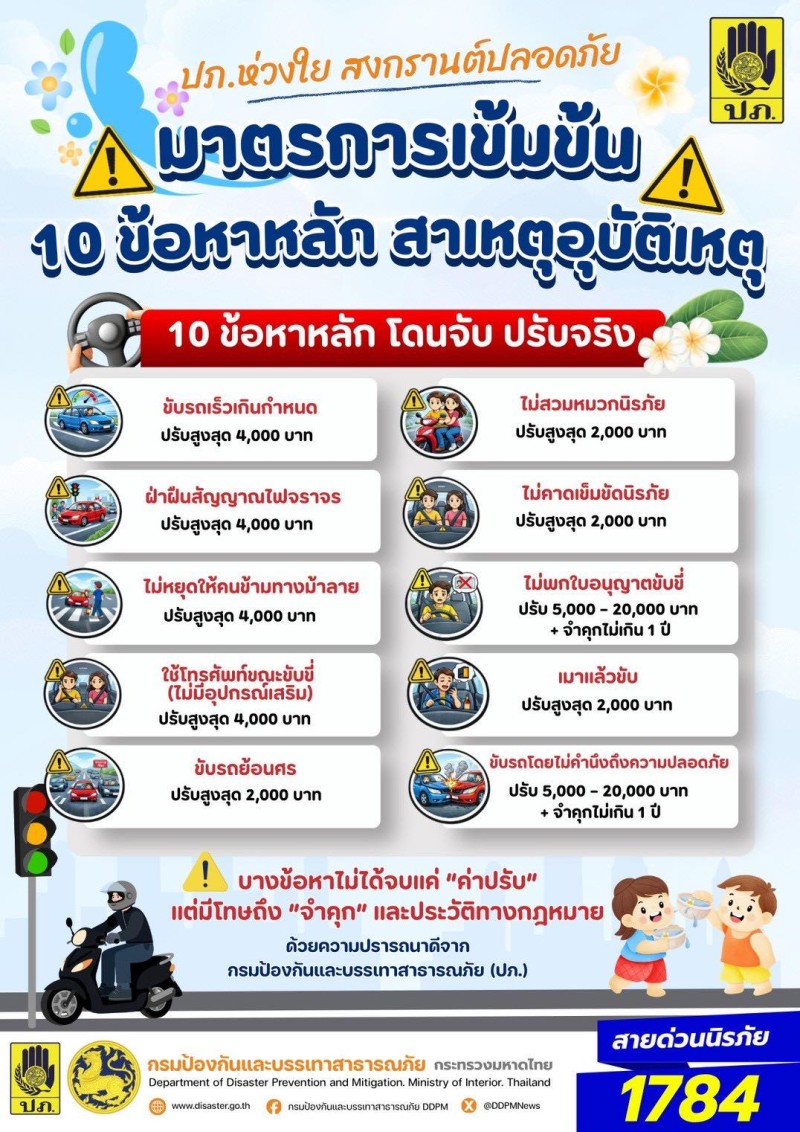 เมื่อวันที่ 14 เมษายน 2569 ตามประกาศ กรมป้องกันและบรรเทาสาธารณภัย DDPM (ปภ.) ระบุว่า ปภ.แสดงความห่วงใยประชาชนในช่วงเทศกาลสงกรานต์ พร้อมเน้นย้ำมาตรการเข้มงวดเพื่อลดอุบัติเหตุทางถนน โดยเฉพาะการควบคุม 10 ข้อหาหลัก ซึ่งเป็นสาเหตุสำคัญของการเกิดอุบัติเหตุ ย้ำหากฝ่าฝืนมีโทษตามกฎหมาย จับจริง ปรับจริง ทั้งนี้ 10 ข้อหาหลัก ดังกล่าวที่มีการประกาศใช้แล้ว มีดังต่อไปนี้