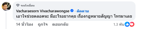 ภายหลังโพสต์ดังกล่าวได้เผยเเพร่ออกไป งานนี้ทำเอาแฟน ๆ แห่กันเข้ามาให้กำลังใจเจ้าตัว กันอย่างไม่ขาดสาย โดยหนึ่งในนั้นพบว่า ท่านอ้น วัชเรศร วิวัชรวงศ์ ก็ได้เข้ามาคอมเมนต์ในโพสต์ดังกล่าวด้วยเช่นกัน โดยระบุเป็นข้อความเชิงให้กำลังใจว่า เอาใจช่วยตลอดนะ มีอะไรอยากคุย เรื่องกฎหมายสัญญา โทรมาเลย งานนี้ทำเอาชาวเน็ตแห่เข้ามากดไลก์ความคิดเห็นดังกล่าวกันอย่างล้นหลามกว่า 1.3 พันคน