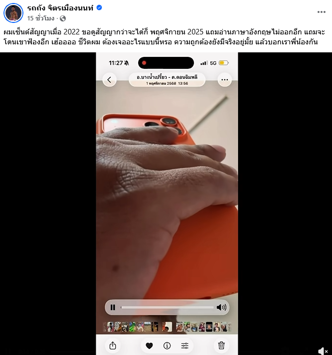 ต่อมา ด้านรถถัง จิตรเมืองนนท์ ได้ออกมาโพสต์คลิป พร้อมกับข้อความผ่านบัญชีเฟซบุ๊ก รถถัง จิตรเมืองนนท์ โดยระบุว่า ผมเซ็นสัญญาเมื่อ 2022 ขอดูสัญญากว่าจะได้ก็ พฤศจิกายน 2025 แถมอ่านภาษาอังกฤษไม่ออกอีก แถมจะโดนเขาฟ้องอีก เฮ้ออออ ชีวิตผม ต้องเจออะไรแบบนี้หรอ ความถูกต้องยังมีจริงอยู่มั้ย แล้วบอกเราพี่น้องกัน