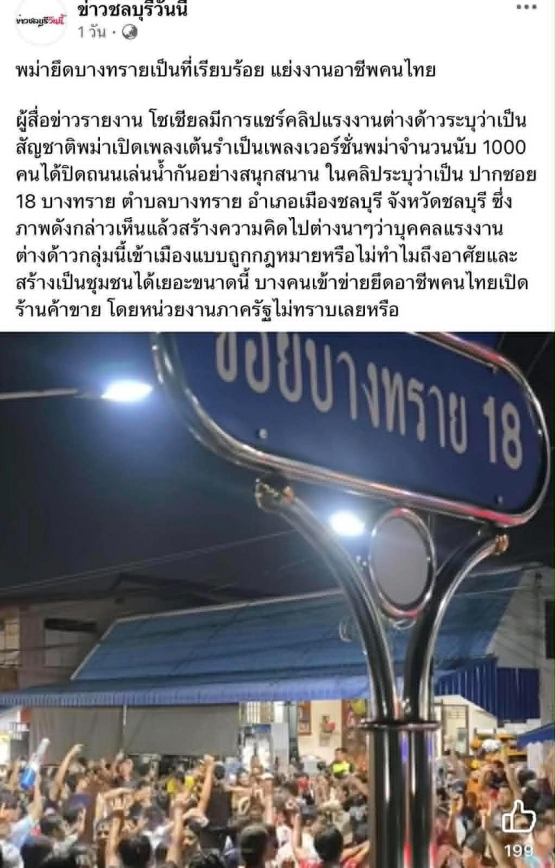 วันที่ 17 เมษายน 2569 ผู้สื่อข่าวได้เดินทางไปยัง พื้นที่ หมู่ที่5 ซอย 18 บางทราย ต.บางทราย อ.เมือง จ. ชลบุรี หลังมีกระแสที่มีเพจท้องถิ่นชลบุรีได้ระบุโพสต์ว่า “ พม่ายึดบางทรายเป็นที่เรียบร้อย แย่งงานอาชีพคนไทย ผู้สื่อข่าวรายงาน โซเชียลมีการแชร์คลิปแรงงานต่างด้าวระบุว่าเป็นสัญชาติพม่าเปิดเพลงเต้นรำเป็นเพลงเวอร์ชั่นพม่าจำนวนนับ 1000 คนได้ปิดถนนเล่นน้ำกันอย่างสนุกสนาน ในคลิประบุว่าเป็น ปากซอย 18 บางทราย ตำบลบางทราย อำเภอเมืองชลบุรี จังหวัดชลบุรี ซึ่งภาพดังกล่าวเห็นแล้วสร้างความคิดไปต่างนาๆว่าบุคคลแรงงานต่างด้าวกลุ่มนี้เข้าเมืองแบบถูกกฎหมายหรือไม่ทำไมถึงอาศัยและสร้างเป็นชุมชนได้เยอะขนาดนี้ บางคนเข้าข่ายยึดอาชีพคนไทยเปิดร้านค้าขาย โดยหน่วยงานภาครัฐไม่ทราบเลยหรือ“