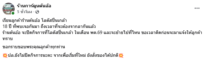 โดยทางร้านได้ออกมาประกาศผ่านเพจเฟซบุ๊ก ร้านการ์ตูนต้นอ้อ โดยระบุว่า เรียนลูกค้าร้านต้นอ้อ โลตัสปิ่นเกล้า 18 ปี ที่พบเจอกันมา ถึงเวลาที่จะต้องจากลากันแล้ว ร้านต้นอ้อ จะปิดกิจการที่โลตัสปิ่นเกล้า ในเดือน พค. 69 ส่วนจะย้ายไปที่ไหน ขอเวลาคิดก่อนจะมาแจ้งให้ลูกค้าทราบ ขอกราบขอบพระคุณลูกค้าทุกท่าน ปล.ยังไม่ปิดกิจการนะคะ จากเพื่อเริ่มที่ใหม่ ยังสั่งของได้ปกติ
