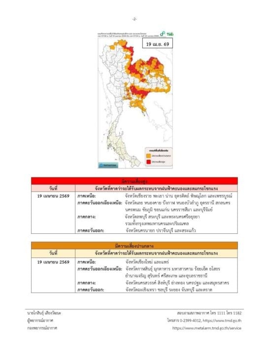 จึงขอให้ประชาชนติดตามประกาศจากกรมอุตุนิยมวิทยา และสามารถติดตามข้อมูลที่เว็บไซต์กรมอุตุนิยมวิทยา http://www.tmd.go.th หรือที่ 0-2399-4012-13 และ 1182 ได้ตลอด 24 ชั่วโมงประกาศ ณ วันที่ 19 เมษายน พ.ศ. 2569 เวลา 05.00 น. กรมอุตุนิยมวิทยาจะออกประกาศฉบับต่อไปในวันที่ 19 เมษายน พ.ศ. 2569 เวลา 17.00 น.