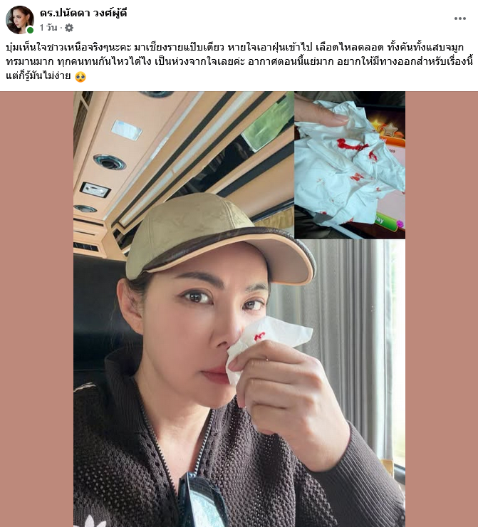 เรียกได้ว่าสร้างความเป็นห่วงให้กับแฟนคลับไม่น้อย เมื่อดร.ปนัดดา วงศ์ผู้ดี หรือที่เราเรียกติดปากกันว่า บุ๋ม ปนัดดา พิธีกรและนักแสดงสาวจิตอาสา ได้ออกมาโพสต์ภาพพร้อมเล่าประสบการณ์ตรง ผ่านบัญชีเฟซบุ๊กส่วนตัว ดร.ปนัดดา วงศ์ผู้ดี หลังเดินทางไปปฏิบัติภารกิจในจังหวัดเชียงราย แต่ต้องเผชิญกับปัญหาฝุ่นละอองขนาดเล็ก PM2.5 ในระดับรุนแรง จนส่งผลกระทบต่อสุขภาพ มีอาการเลือดกำเดาไหล