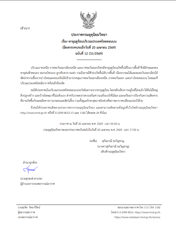 จึงขอให้ประชาชนติดตามประกาศจากกรมอุตุนิยมวิทยา และสามารถติดตามข้อมูลที่เว็บไซต์กรมอุตุนิยมวิทยา http://www.tmd.go.th หรือที่ 0-2399-4012-13 และ 1182 ได้ตลอด 24 ชั่วโมง ประกาศ ณ วันที่ 20 เมษายน พ.ศ. 2569 เวลา 05.00 น. กรมอุตุนิยมวิทยาจะออกประกาศฉบับต่อไปในวันที่ 20 เมษายน พ.ศ. 2569 เวลา 17.00 น.