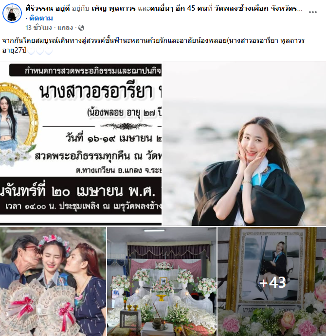 วันที่ 21 เมษายน 2569 ที่วัดพลงช้างเผือก มีรายงานข่าวเศร้าในวงการคอนเทนต์ครีเอเตอร์ เมื่อ พลอย อรอารียา พูลถาวร หรือ พลอยชอบถ่ายรูป อินฟลูเอนเซอร์สาวสายไลฟ์สไตล์และการถ่ายภาพ วัย 27 ปี เสียชีวิตกะทันหันจากอุบัติเหตุ สร้างความตกใจและความเสียใจให้กับผู้ติดตาม รวมถึงคนใกล้ชิดเป็นอย่างมาก