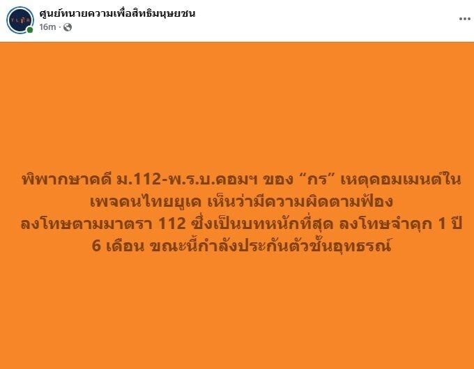 วันที่ 21 เมษายน 2569 ศูนย์ทนายความเพื่อสิทธิมนุษยชน รายงานว่า ศาลอาญานัดฟังคำพิพากษาคดี ม.112 และ พ.ร.บ.คอมพิวเตอร์ ของ กร (นามสมมติ) ครูสอนนาฏศิลป์ในโรงเรียนเอกชนแห่งหนึ่งในจังหวัดชัยนาท หลังเข้าไปคอมเมนต์ในเพจ KTUK - คนไทยยูเค เมื่อวันที่ 1 มีนาคม 2564