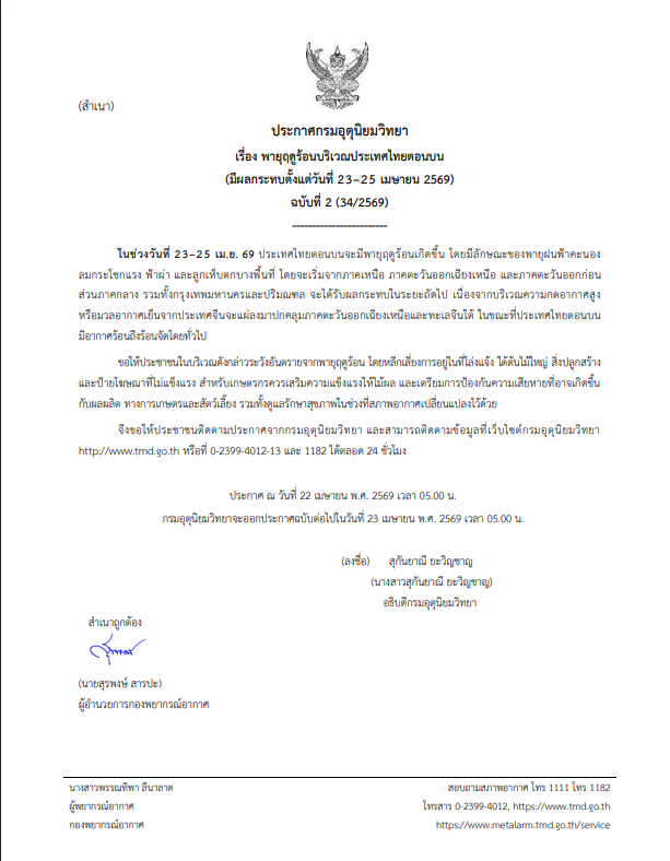 วันที่ 22 เมษายน 2569 กรมอุตุนิยมวิทยา ในช่วงวันที่ 23–25 เม.ย. 69 ประเทศไทยตอนบนจะมีพายุฤดูร้อนเกิดขึ้น โดยมีลักษณะของพายุฝนฟ้าคะนองลมกระโชกแรง ฟ้าผ่า และลูกเห็บตกบางพื้นที่ โดยจะเริ่มจากภาคเหนือ ภาคตะวันออกเฉียงเหนือ และภาคตะวันออกก่อนส่วนภาคกลาง รวมทั้งกรุงเทพมหานครและปริมณฑล จะได้รับผลกระทบในระยะถัดไป เนื่องจากบริเวณความกดอากาศสูงหรือมวลอากาศเย็นจากประเทศจีนจะแผ่ลงมาปกคลุมภาคตะวันออกเฉียงเหนือและทะเลจีนใต้ ในขณะที่ประเทศไทยตอนบนมีอากาศร้อนถึงร้อนจัดโดยทั่วไป