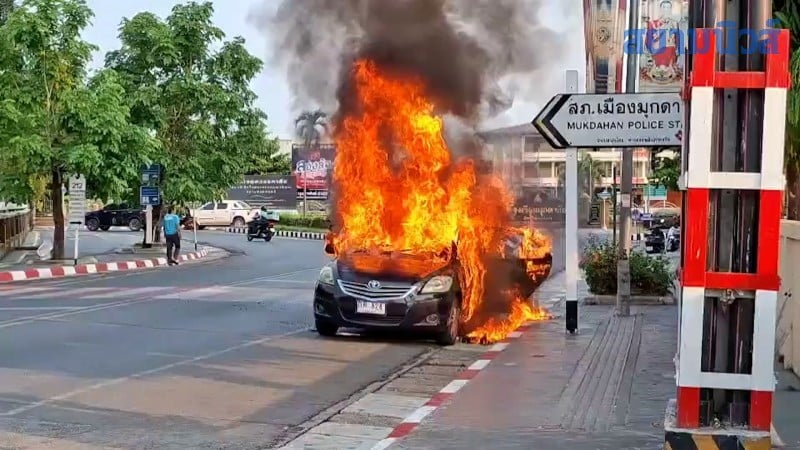 เกิดเหตุระทึกขวัญกลางเมืองมุกดาหารเมื่อช่วงเวลาประมาณ 17:00 น. ขปงวันที่ 21 เมษายน 2569 ที่ผ่านมา เกิดเหตุเพลิงไหม้รถยนต์นั่งส่วนบุคคลบริเวณหน้าโรงพยาบาลมุกดาหาร โดยมีผู้อยู่ในรถทั้งหมด 4 คนโชคดีที่ไหวตัวทันหนีออกมาได้ก่อนไฟลุกท่วม