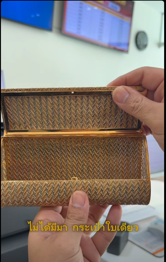 ทั้งนี้ กระเป๋าทองคำดังกล่าวไม่ปรากฏแบรนด์ใดๆ คาดว่าอาจเป็นงานสั่งทำพิเศษ อย่างไรก็ตาม หากผู้มีความรู้สามารถให้ข้อมูลเพิ่มเติมเกี่ยวกับที่มาของชิ้นงานได้ ทางร้านยินดีรับฟังความคิดเห็นเพิ่มเติม