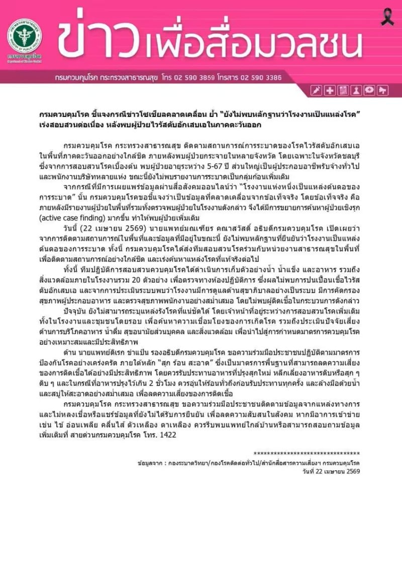 วันที่ 23 เมษายน 2569 กระทรวงสาธารณสุข โดยกรมควบคุมโรค ชี้แจงสถานการณ์โรคไวรัสตับอักเสบเอในพื้นที่ภาคตะวันออก หลังพบผู้ป่วยเพิ่มขึ้น โดยยืนยันยังไม่พบหลักฐานว่าโรงงานเป็นแหล่งต้นตอการระบาด