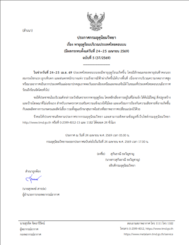 วันที่ 24 เมษายน 2569 กรมอุตุนิยมวิทยา พยากรณ์อากาศ ในช่วงวันที่ 24–25 เม.ย. 69 ประเทศไทยตอนบนจะมีพายุฤดูร้อนเกิดขึ้น โดยมีลักษณะของพายุฝนฟ้าคะนอง ลมกระโชกแรง ลูกเห็บตก และฝนตกหนักบางแห่ง รวมถึงอาจมีฟ้าผ่าเกิดขึ้นได้บางพื้นที่ เนื่องจากบริเวณความกดอากาศสูงหรือมวลอากาศเย็นจากประเทศจีนแผ่ลงมาปกคลุมภาคตะวันออกเฉียงเหนือและทะเลจีนใต้ ในขณะที่ประเทศไทยตอนบนมีอากาศร้อนถึงร้อนจัดโดยทั่วไป