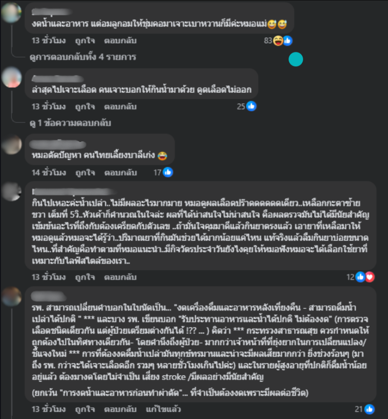 หมอแม่ ระบุว่า ตอนนี้กำลังมีประเด็นถกเถียงว่าเราไปเจาะเลือดต้องงดน้ำงดอาหาร 6 ชั่วโมงไหม เพราะมีคุณหมอออกมาอธิบายว่าจริงๆแล้ว เราดื่มน้ำได้ตามปกติเลยถ้าเราจะไปเจาะเลือด แต่แม่จะมาอธิบายว่า จริงๆแล้วมันควรเป็นยังไง