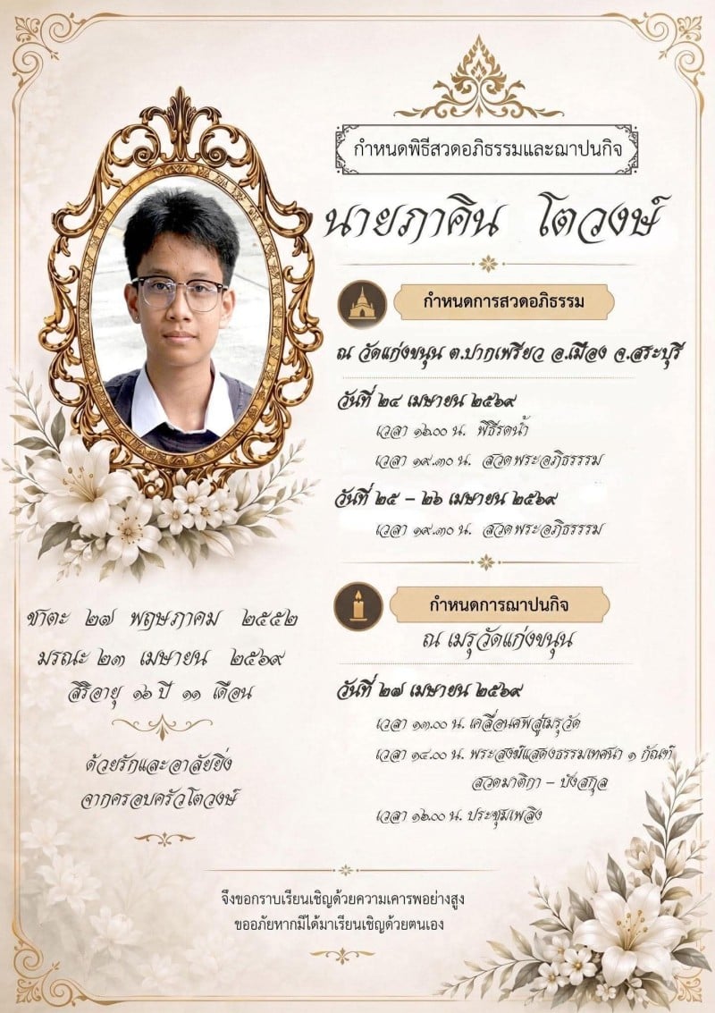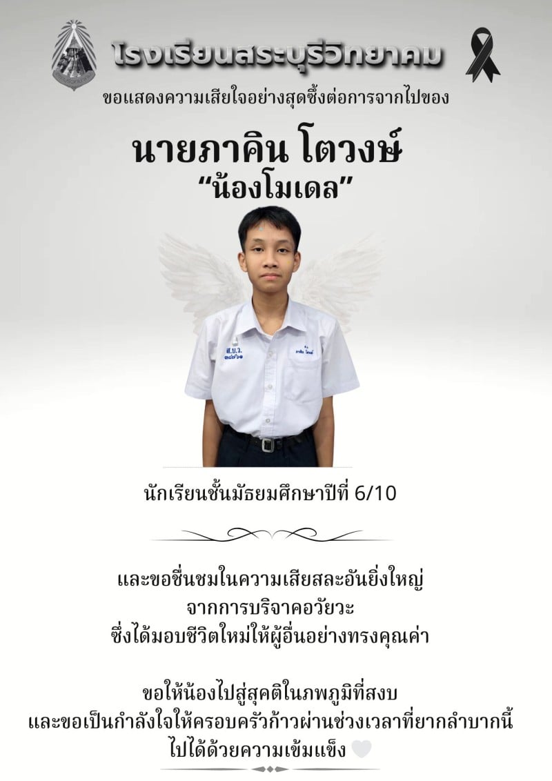 วันที่ 24 เมษายน 2569 กลายเป็นเรื่องราวที่สร้างความซาบซึ้งและเรียกหยาดน้ำตาจากชาวโซเชียลอย่างมาก เมื่อโรงเรียนสระบุรีวิทยาคม จังหวัดสระบุรี พร้อมด้วยทีมอีสปอร์ตของโรงเรียน ได้ร่วมกันโพสต์ไว้อาลัยต่อการจากไปของ นายภาคิน หรือ น้องโมเดล นักเรียนชั้นมัธยมศึกษาปีที่ 6/10 ที่เสียชีวิตลงอย่างกะทันหันจากอุบัติเหตุ แต่ได้สร้างคุณูปการครั้งยิ่งใหญ่ด้วยการบริจาคอวัยวะเพื่อส่งต่อชีวิตใหม่ให้กับเพื่อนมนุษย์
