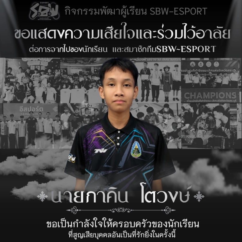 ทางทีมต้องขอแสดงความเสียใจ และขอบคุณที่นักเรียนปฏิบัติตนเป็นตัวอย่างที่ดี ทั้งในฐานะนักเรียนและนักกีฬาอีสปอร์ตที่มุ่งมั่น สนับสนุนและสร้างชื่อเสียงให้กับโรงเรียนมาโดยตลอด ขอให้น้องเดินทางไปสู่ภพภูมิที่ดี มีแต่ความสุข