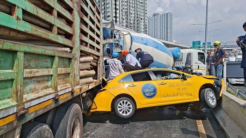 เหตุเกิดเมื่อเวลาประมาณ 09.21 น. รถบรรทุก 10 ล้อยี่ห้ออีซูซุ ทะเบียนจังหวัดปราจีนบุรี ขับโดยนายจำปี อายุ 67 ปี ซึ่งได้รับบาดเจ็บเล็กน้อย ให้การว่า ขับรถบรรทุกไม้เต็มคันมาจากถนนกัลปพฤกษ์ มุ่งหน้าถนนเพชรเกษม ระหว่างทางมีฝนตกทำให้ถนนลื่น ก่อนรถจะเกิดเบรกแตก ลมหมดหม้อ แม้พยายามควบคุมรถและตัดสินใจดับเครื่อง แต่ไม่สามารถหยุดรถได้ เนื่องจากเป็นทางลงสะพาน ทำให้รถไหลพุ่งชนรถคันอื่นอย่างต่อเนื่อง