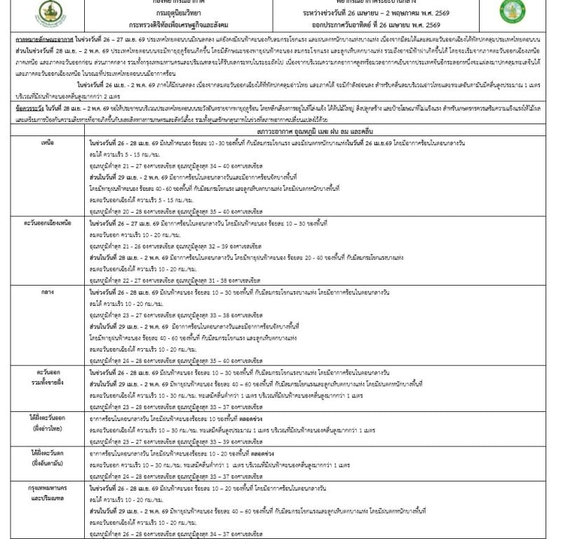ในช่วงวันที่ 26-28 เม.ย. 69 มีฝนฟ้าคะนอง ร้อยละ 10–30 ของพื้นที่ กับมีลมกระโชกแรงบางแห่ง โดยมีอากาศร้อนในตอนกลางวัน ลมใต้ ความเร็ว 10-20 กม./ชม. อุณหภูมิต่ำสุด 23–27 องศาเซลเซียส อุณหภูมิสูงสุด 33–38 องศาเซลเซียส