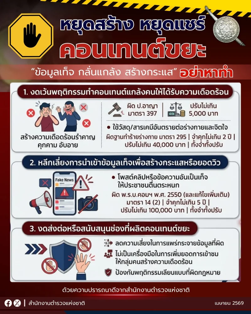 สุดท้ายนี้ หากพี่น้องประชาชนพบเห็นการกระทำความผิด การสร้างคอนเทนต์ที่ก่อให้เกิดความเดือดร้อนรำคาญในที่สาธารณะ หรือได้รับความเสียหายจากการถูกกลั่นแกล้ง สามารถแจ้งเบาะแสการกระทำความผิดหรือเหตุด่วนเหตุร้าย สายด่วน 191, แจ้งเบาะแสการกระทำความผิด สายด่วนสำนักงานตำรวจแห่งชาติ 1599 ได้ตลอด 24 ชั่วโมง