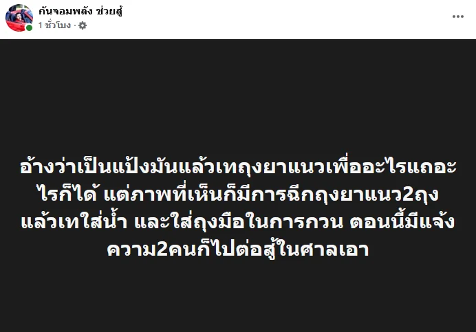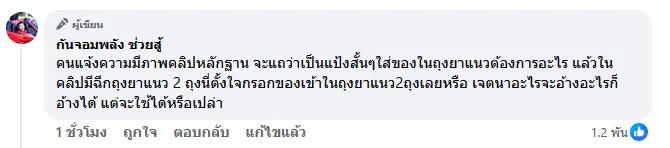 ก่อนจะระบุเพิ่มเติมในคอมเมนต์ใต้โพสต์ดังกล่าวว่า คนแจ้งความมีภาพคลิปหลักฐาน จะแถว่าเป็นแป้งสั้น ๆ ใส่ของในถุงยาแนวต้องการอะไร แล้วในคลิปมีฉีกถุงยาแนว 2 ถุง นี่ตั้งใจกรอกของเข้าในถุงยาแนว 2 ถุงเลยหรือ เจตนาอะไร จะอ้างอะไรก็อ้างได้ แต่จะใช้ได้หรือเปล่า
