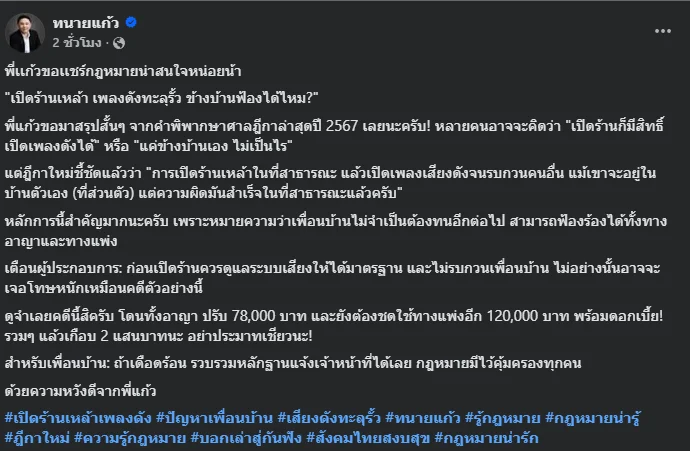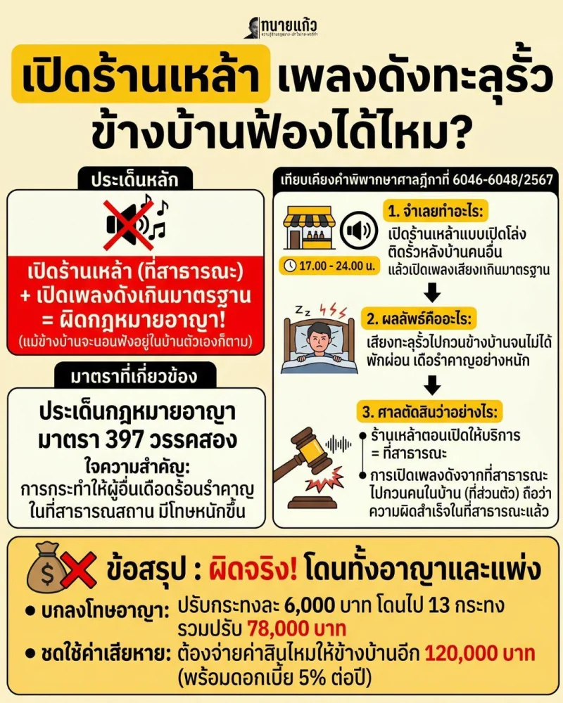วันที่ 28 เมษายน 2569 ดร.มนต์ชัย จงไกรรัตนกุล หรือ ทนายแก้ว ออกมาแชร์ข้อกฎหมายน่าสนใจ กรณีเปิดร้านเหล้าเปิดเพลงเสียงดังรบกวนเพื่อนบ้าน พร้อมอ้างอิงคำพิพากษาศาลฎีกาล่าสุดปี 2567 ชี้ชัดว่าแม้ผู้เดือดร้อนจะอยู่ในบ้านของตนเอง แต่หากต้นเหตุเกิดในที่สาธารณะ ความผิดถือว่าสำเร็จแล้ว และสามารถฟ้องร้องได้ทั้งทางอาญาและทางแพ่ง