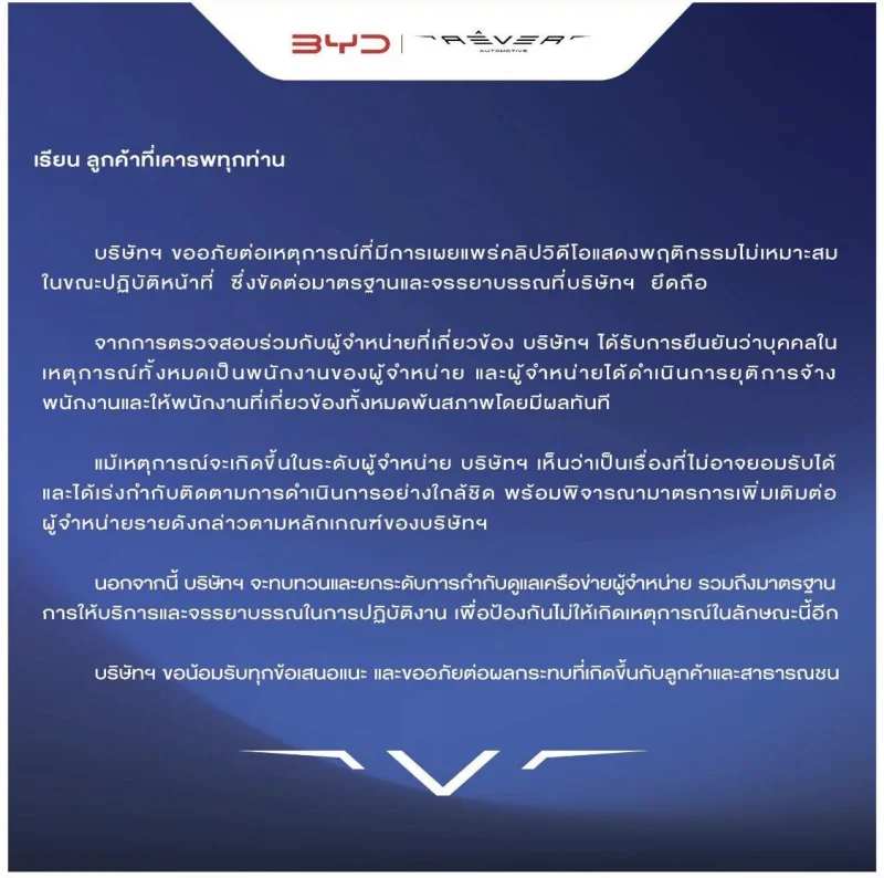 วันที่ 30 เมษายน 2569 บริษัท BYD ชี้แจงกรณีคลิปพนักงานผู้จำหน่ายแสดงพฤติกรรมไม่เหมาะสมระหว่างปฏิบัติหน้าที่ สั่งยุติการจ้างทันที พร้อมเร่งคุมเข้มมาตรฐานเครือข่าย