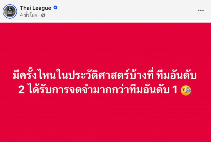 ล่าสุด เพจทางการของ Thai League (ไทยลีก) ได้โพสต์ข้อความว่า มีครั้งไหนในประวัติศาสตร์บ้างที่ ทีมอันดับ 2 ได้รับการจดจำมากกว่าทีมอันดับ 1 ก่อนที่ต่อมาโพสต์ดังกล่าวจะถูกลบทิ้งภายหลัง