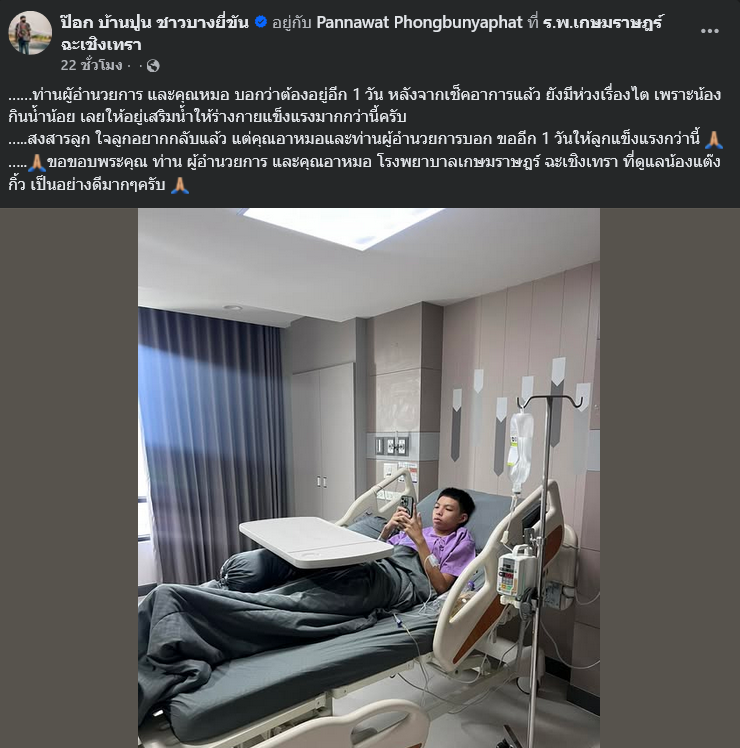 ผู้ใช้เฟซบุ๊ก ป๊อก บ้านปูน ชาวบางยี่ขัน คุณพ่อของ แต๊งกิ้ว ปัญณวัฒน์ พงษ์บุญญพัฒน์ กองกลางเบอร์ 14 ของ หมอนทองวิทยา อัปเดตอาการล่าสุดของลูกชายหลังต้องเข้าโรงพยาบาล เนื่องจากมีไข้สูง และร่างกายอ่อนเพลีย